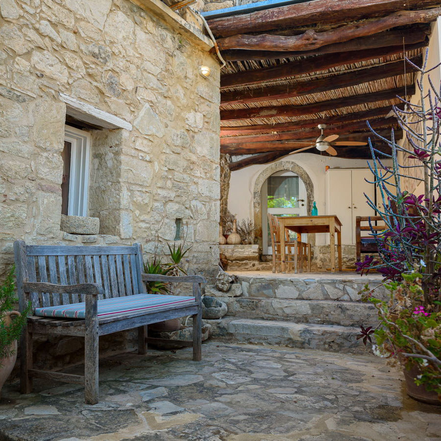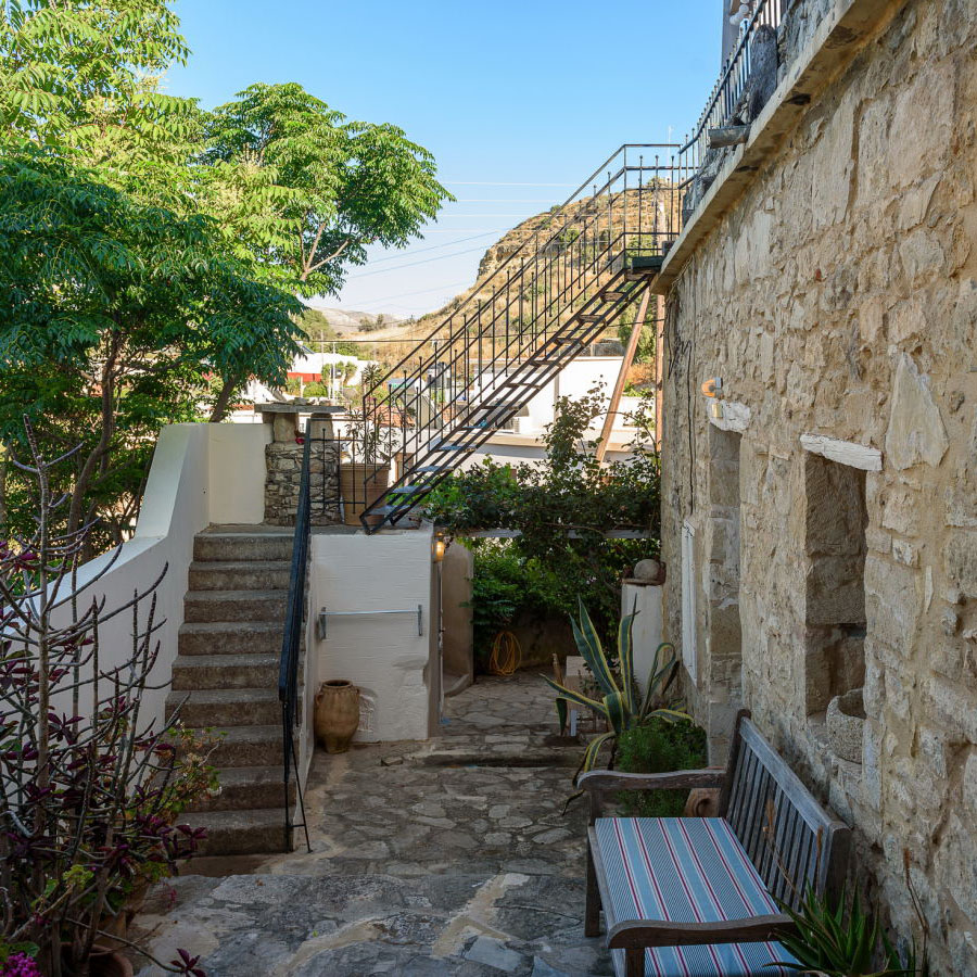 Hier spielt sich das Leben zwischen drinnen und draußen ab. Die Wohnungen öffnen sich zu mehreren Terrassen auf unterschiedlichen Ebenen: sonnig oder schattig, offen oder geschützt, mit Blick ins Dorf, in die Berge der Messara-Ebene oder in den Himmel über Pitsidia.