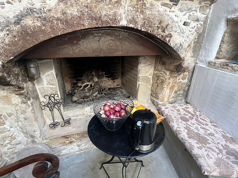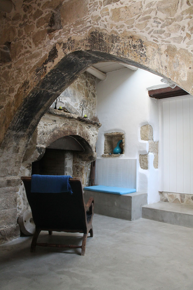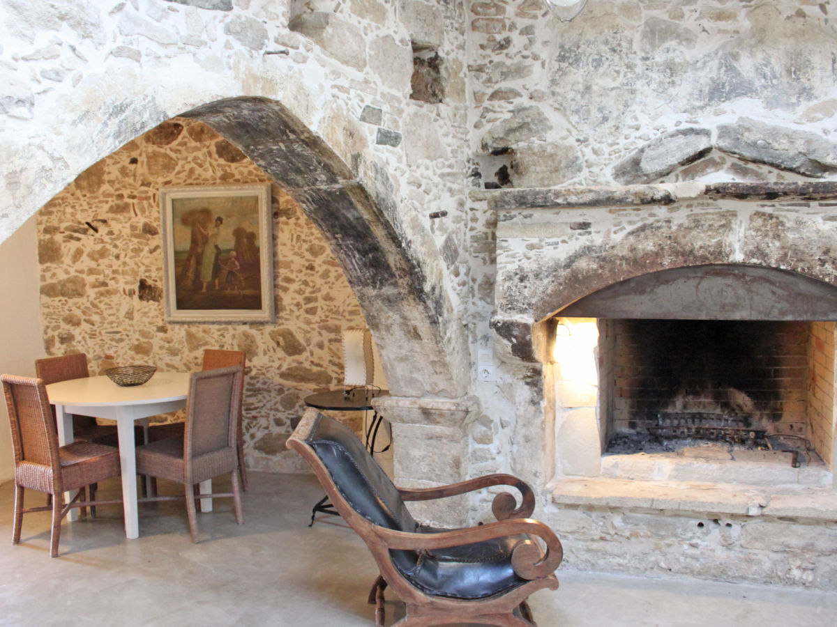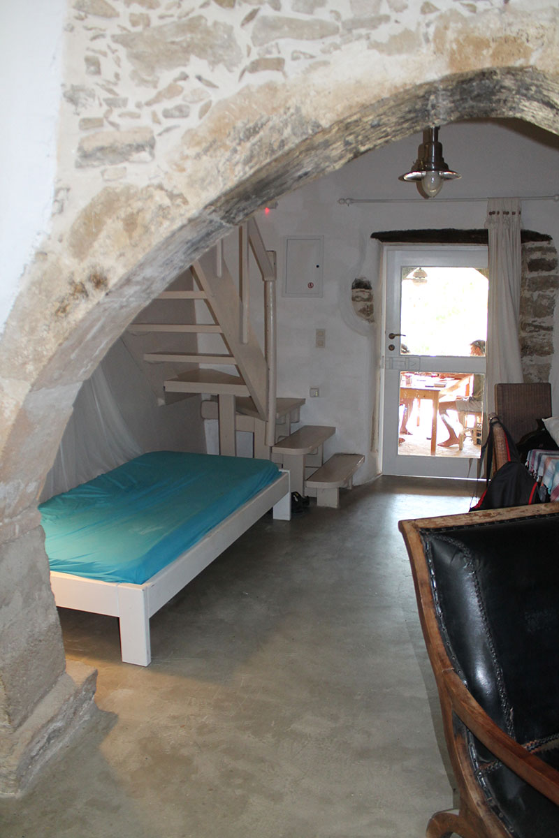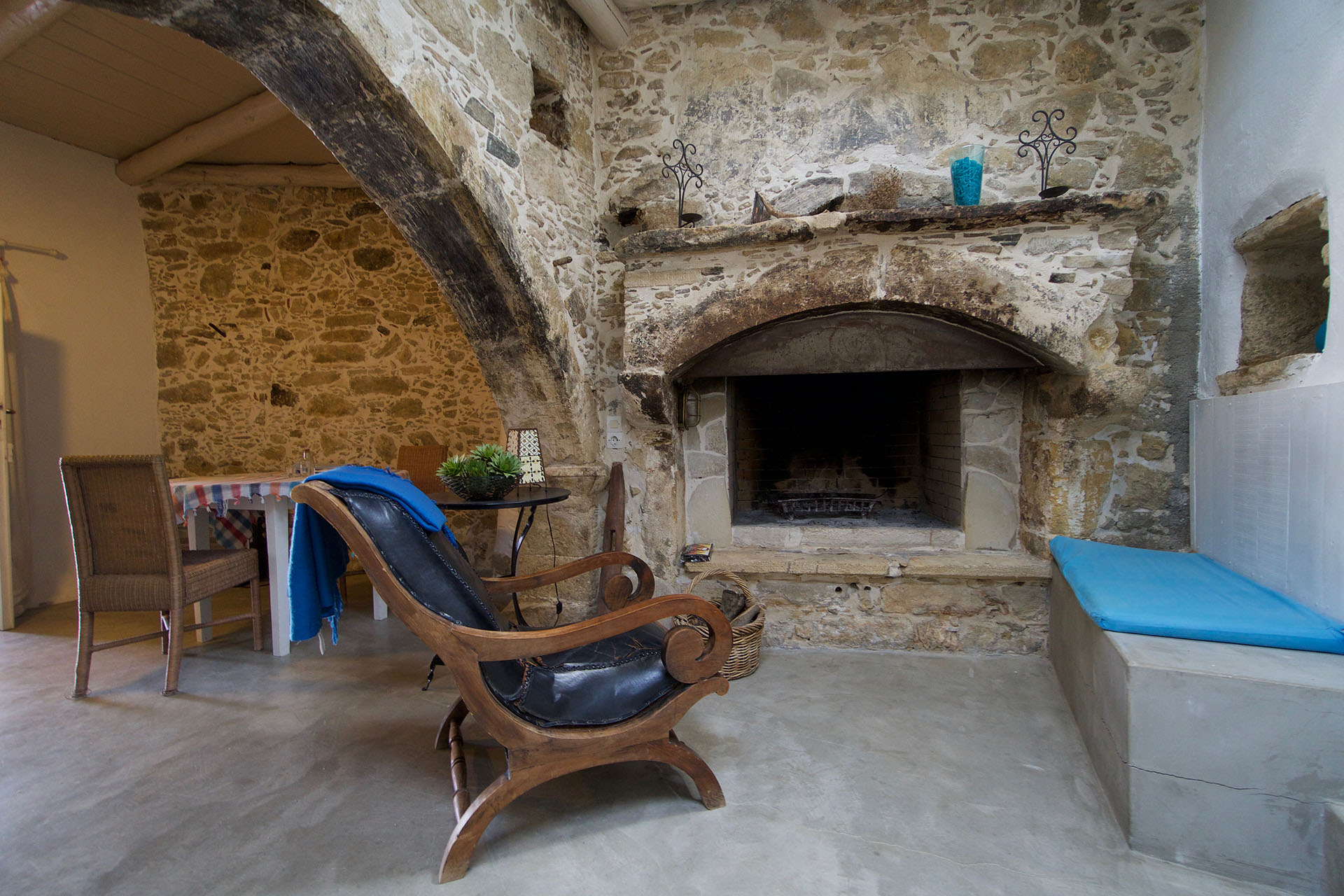 Im Erdgeschoss des Ouranós Blé befindet sich der offene Wohn- und Essbereich mit seiner zeitlosen Architektur, seiner Offenheit und seinem ganz besonderen Klima. Im Sommer staunt man über die Kühle dieses beindruckenden Raums, in kühleren Jahreszeiten strahlt der große Kamin Wärme, Atmosphäre und eine besondere Gemütlichkeit aus.