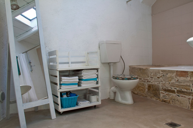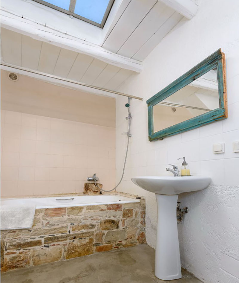 Das Bad mit viel Stellfläche und komfortabler Badewanne schließt an die offene Küche an.