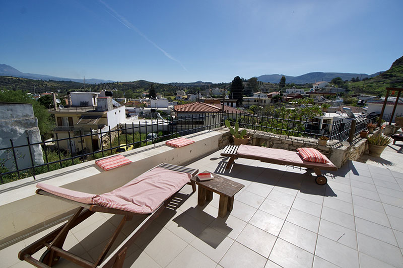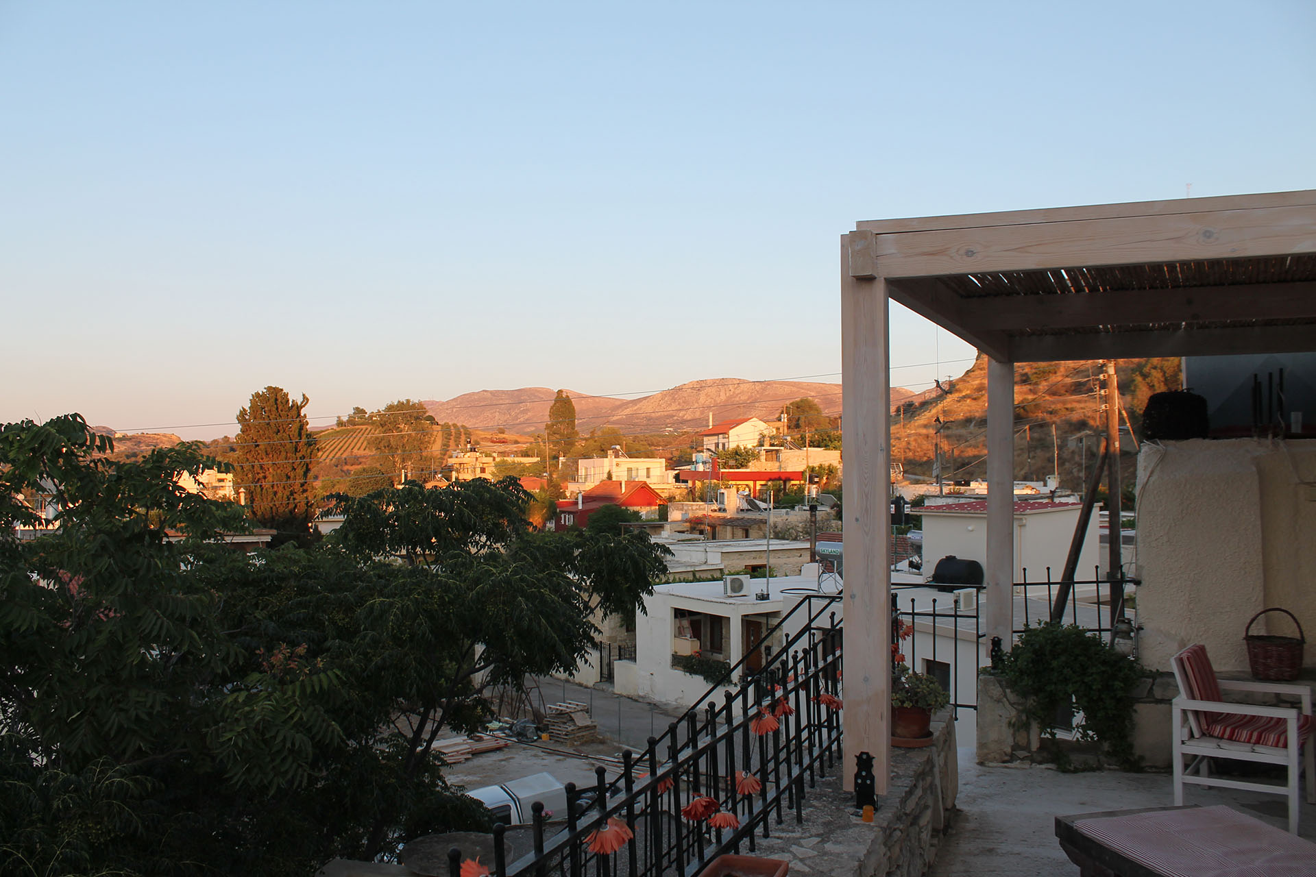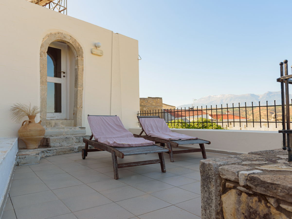Vom Schlafzimmer aus öffnen sich zwei weitere Terrassen: eine obere Wohnterrasse, die Teil des atmosphärischen Himmelsblicks über Pitsidia ist, und eine weitere, überdachte Terrasse auf der anderen Seite, die Schatten und einen ruhigen Rückzugsort bietet.