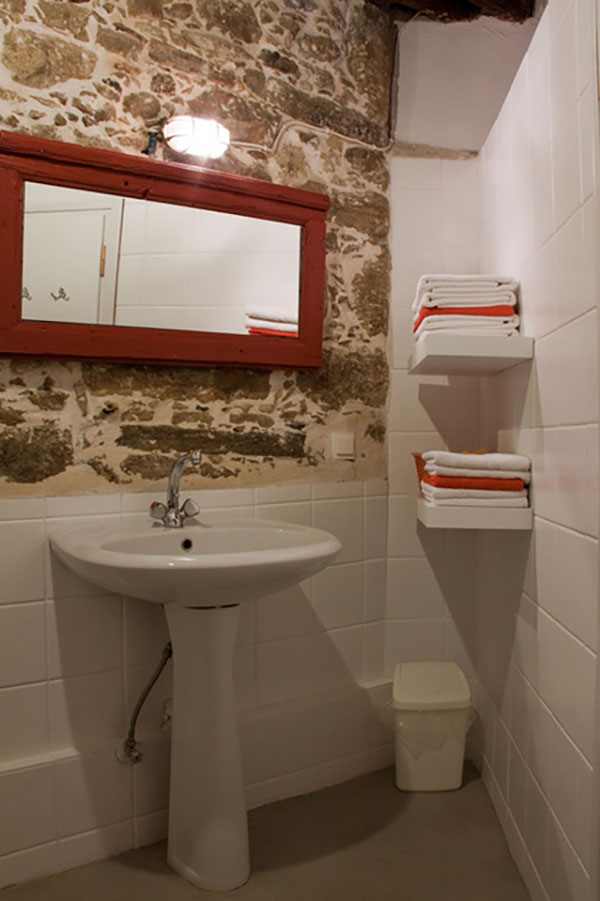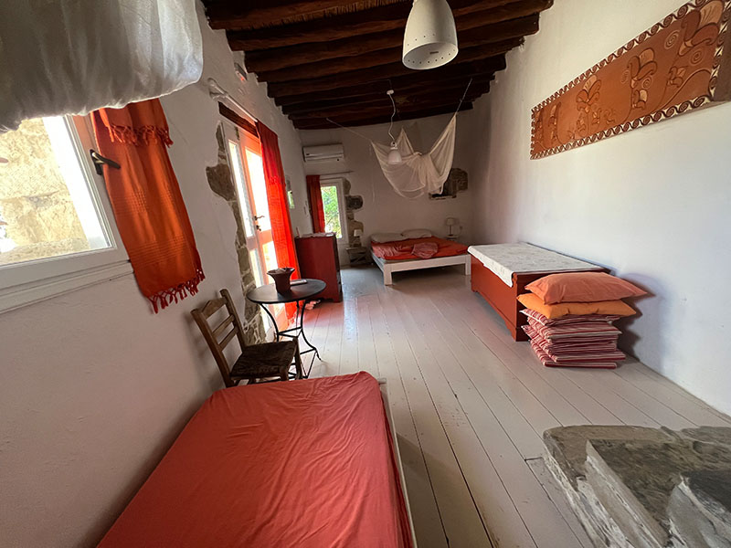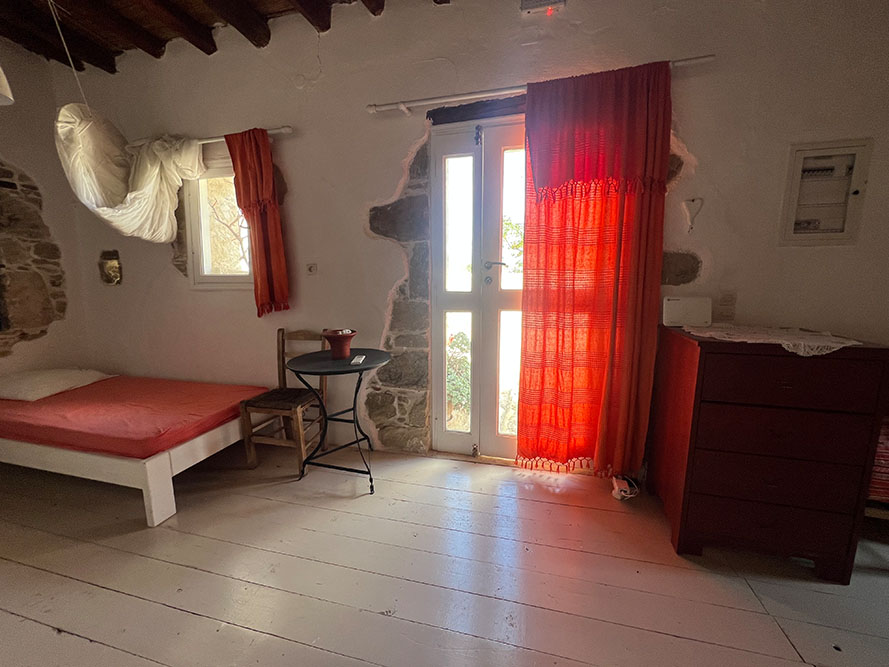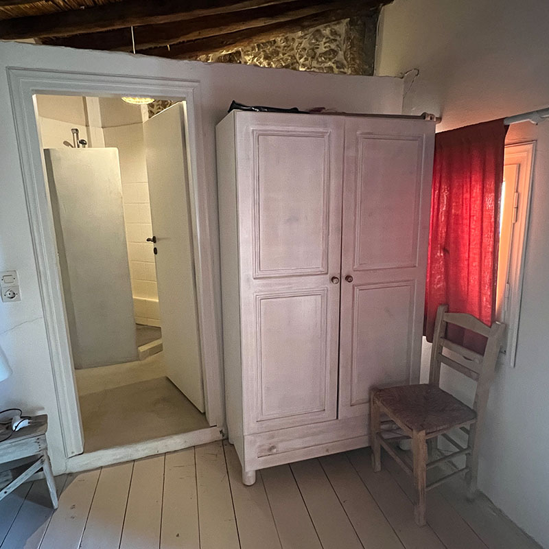 Der kleinere Schlafraum bietet zwei weitere Schlafgelegenheiten, einen Kleiderschrank und den Zugang zum Bad. Für Paare, kleine Familien oder Freunde wird er ganz selbstverständlich zum Ankleideraum oder stillen Rückzugsort. Auch dieser Raum hat einen eigenen Eingang und öffnet sich zur überdachten Terrasse, die zwischen beiden Wohnungen liegt und selbst an warmen Tagen angenehm kühl bleibt – ein wunderbarer Platz für den ersten Kaffee oder eine Pause zwischendurch.