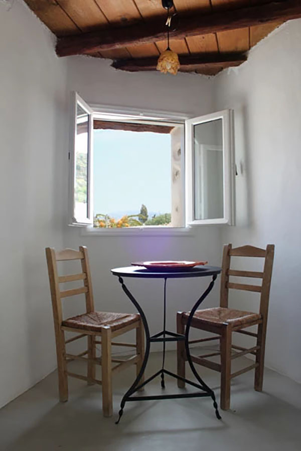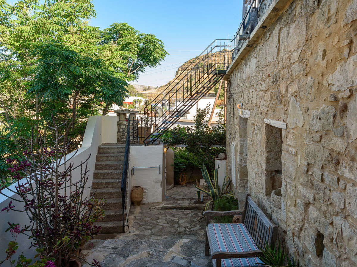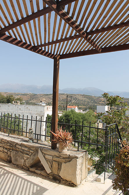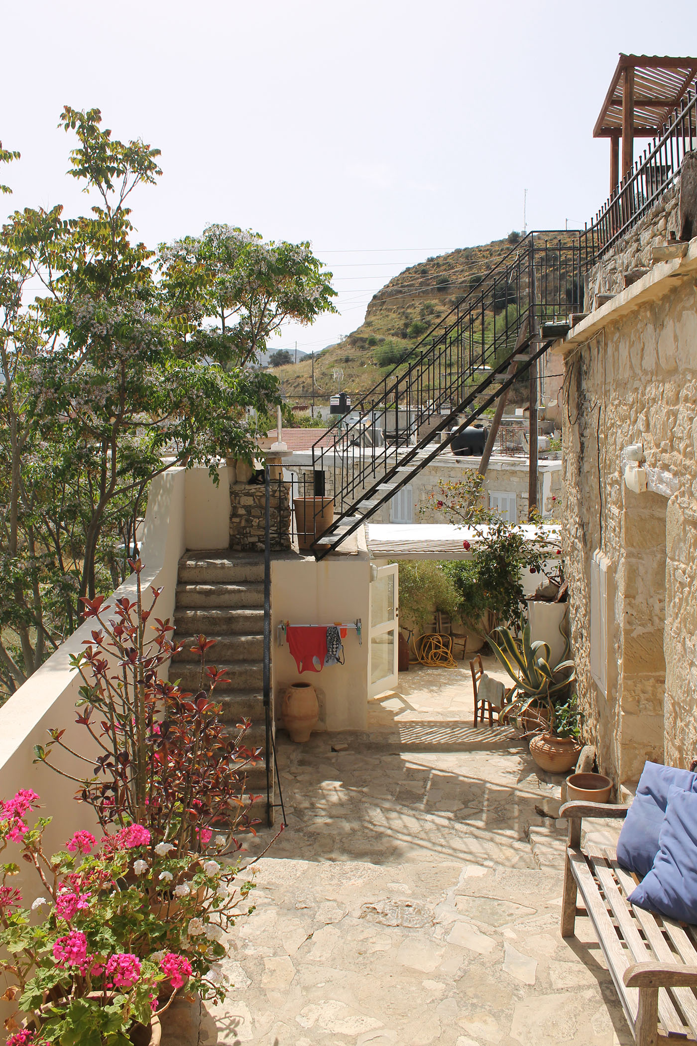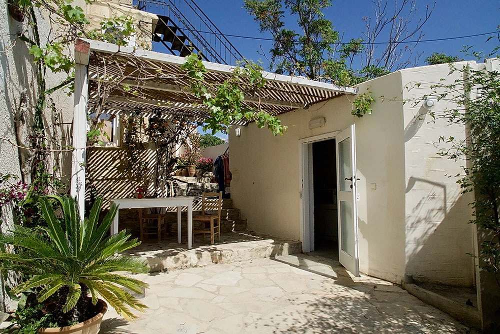 Die Wohnung Kokkinos verfügt über mehrere Terrassen auf unterschiedlichen Ebenen, jede mit eigenem Charakter. Eine direkt am Küchenhaus, eine überdachte Terrasse zwischen den beiden Wohnungen und die Sonnenterrassen auf dem Dach.
