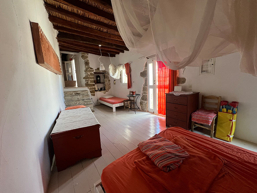 Im großen Wohn- und Schlafraum erwarten Sie ein komfortables Doppelbett und ein Einzelbett. Holz, Bruchstein, Kommoden und Truhen verleihen dem Raum eine warme, authentische Atmosphäre. Das Licht fällt sanft durch den Raum – man fühlt sich sofort angekommen und entspannt.