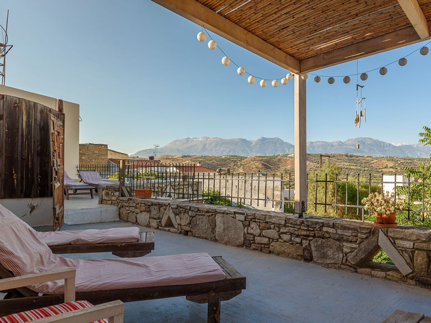 Auf dem Dach des Kokkinos befinden sich die Sonnenterrassen. Wählen Sie zwischen Liegen und Stühlen – und genießen Sie den fantastischen Blick in die Berge.
